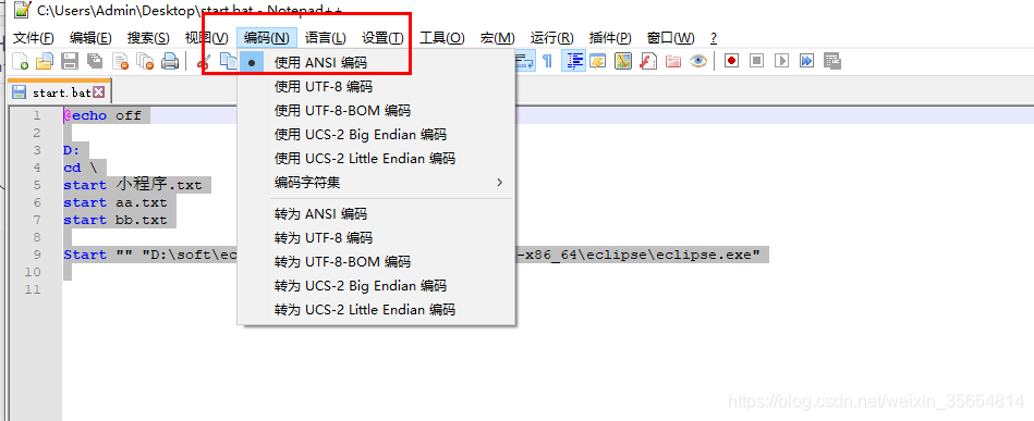 然后点击保存,再另存为 bat 后缀的执行文件(注意,文件内容有中文时,保存的编码必须改为 ANSI 否则会报中文错误,txt 另存时可以选)