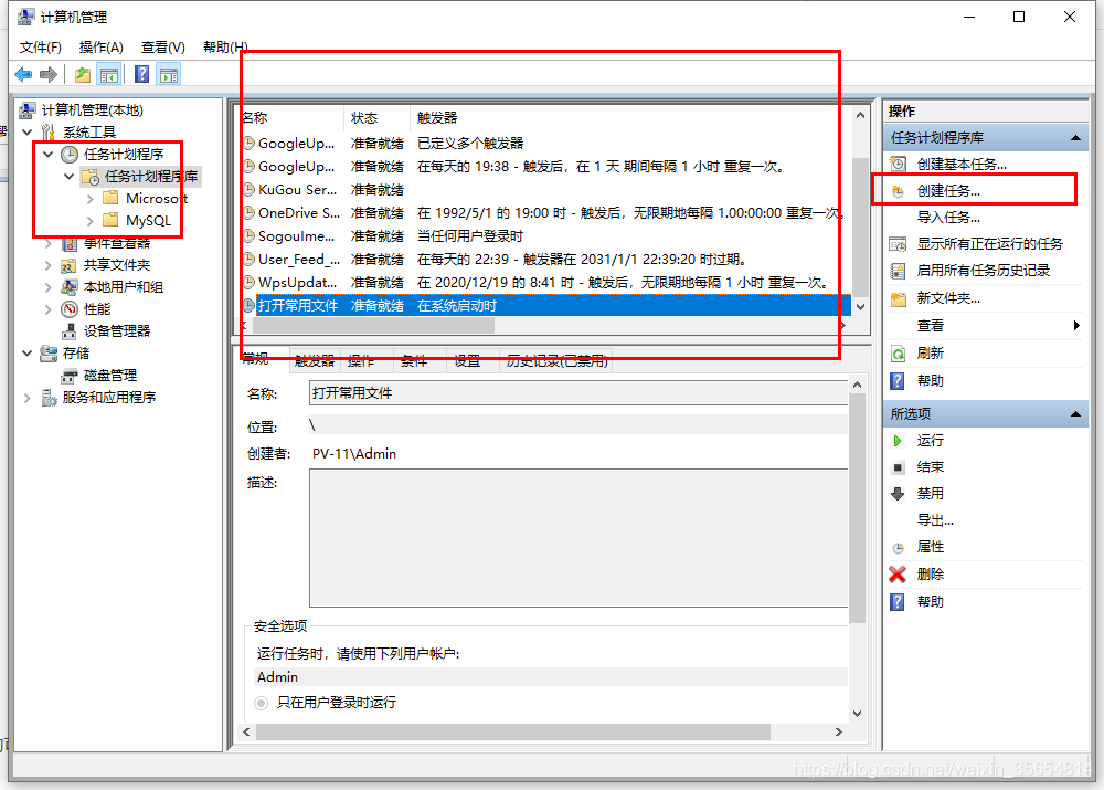 - 点击【任务计划程序库】可以看到已经存在的任务和文件夹等,有些任务计划不需要的可以禁用掉,点击右边的创建任务,打开任务界面写上任务名称