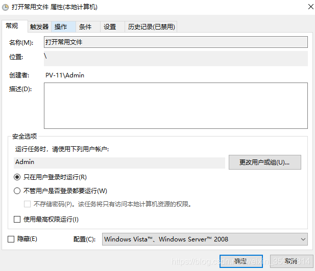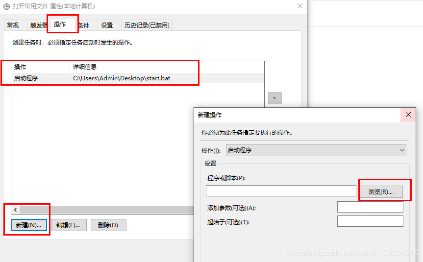 然后在【操作】项新建一个启动程序,选择编写好的执行脚本,再确定即可。