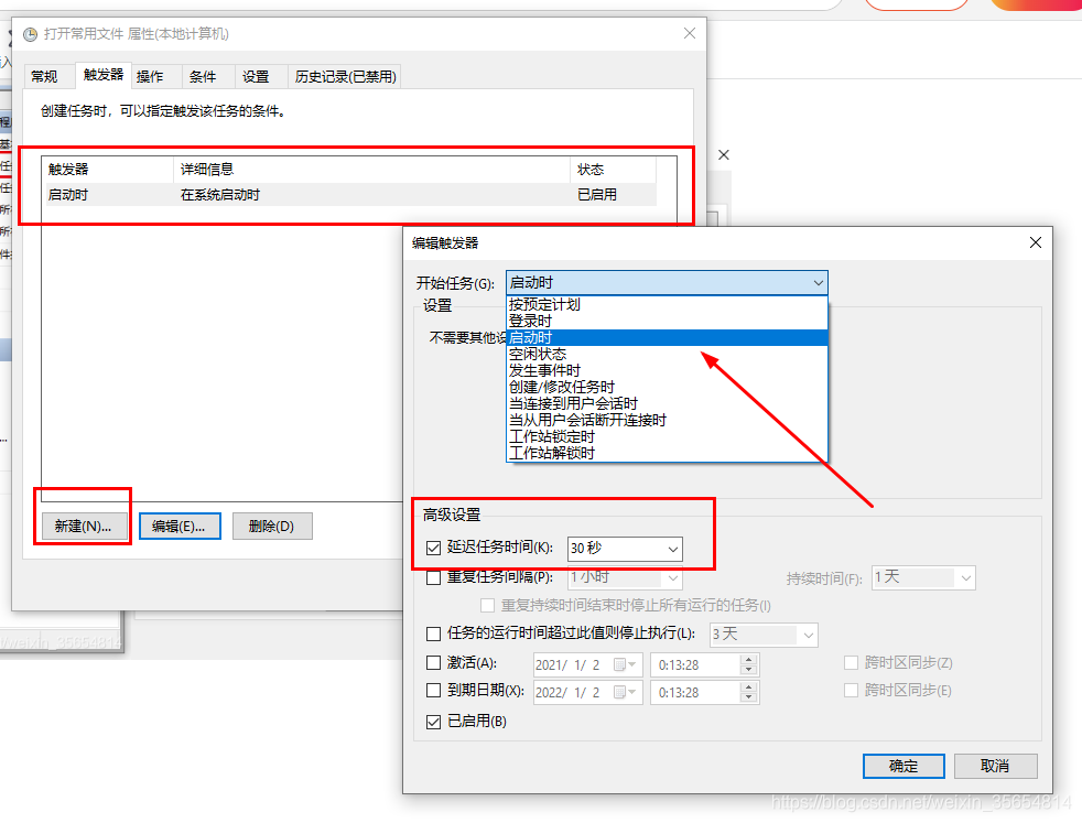 新建一个触发器进行编辑,选择时机【启动时】就是开机启动,再加个延迟 30 秒执行,如果不加延迟会导致无法执行任务(亲测不加时无效),可能是启动时其他自启动程序在执行造成的影响。